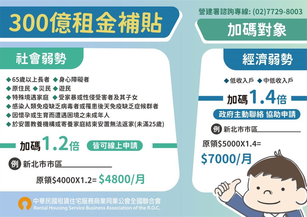為落實照顧租屋民眾、減輕租屋族壓力,行政院今年7月推動的300億元中央擴大租金補貼專案計畫,本開放民眾申請至10月底止,不過為擴大對經濟弱勢族群的居住支持,內政部持續檢討專案內容並提報修正計畫,已於11月28日獲行政院核定。此次對象僅限經濟或社會弱勢戶,將於12月5日(週一)上午9時再次開放申請,至12月30日(週五)下午17時截止申請,有需要之民眾可留意。
