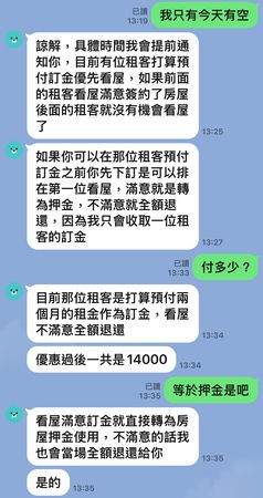 更加強不租就租不到的搶手景象表示,「如果你可以在那位租客預付訂金前先下訂,是可以排在第一位看屋,滿意就是轉為押金,不滿意就全額退還,因為我只會收取一位租客的訂金。」收取看屋訂金為14000元,等於2個月的押金金額。