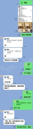 實際上循線加入假房東的通訊軟體,這間位於沙鹿區的套房,家具不僅一應俱全,約9坪面積租金7500元還包停車位,不僅能養寵物更是採用台水台電,記者佯裝要租屋,並要求直接看屋,但假房東只願意在通訊軟體上對話,電話不接、但也夠阿莎力一口氣調降500元月租金。
