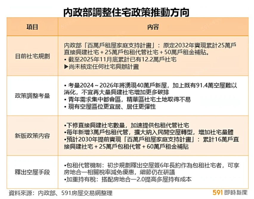 根據《工商時報》報導,政府原訂2032年實現「百萬戶租屋家庭支持計畫」,包含25萬戶社宅、25萬戶包租代管及50萬戶租補。國土署長吳欣修說明,雖然下修社宅興建量,但是照顧百萬家戶的計畫不變、甚至可提前達標;明年起將每年新增3萬戶包租代管,預計在2030年可達到25萬戶包租代管、16萬戶社宅及60萬戶租金補貼。